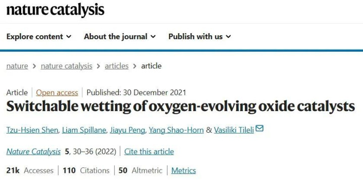 该工作通过原位液相透射电镜(operando TEM)与能量损失谱(EELS)等表征手段,揭示了钙钛矿型和尖晶石型钴基氧化物(如BSCF、Co₃O₄)催化剂在电位调控下表面亲疏水性的可逆转变规律。实验发现,在水溶液中低电位下催化剂表面整体呈疏水性,随着正极电位提升,表面逐步转变为亲水,并伴随催化活性氧羟化物相的形成。这种“电润湿”过程通过促进OH⁻在表面富集,提高了OER(析氧反应)的电荷转移速率和界面反应活性。进一步,高电位下形成的分子氧有效减薄了界面液层,反映出表面润湿状态与氧气析出过程密切相关。该工作直观证明了亲疏水性可调控对氧化物催化剂界面反应动力学和稳定性的根本作用。