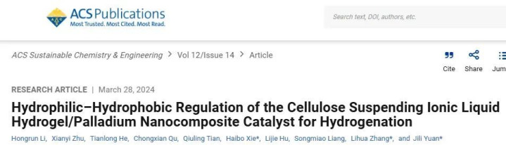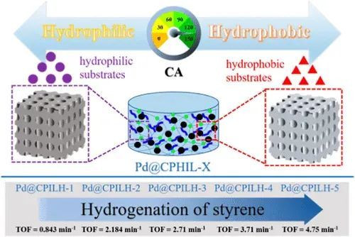 该研究开发了一类基于纤维素-离子液体水凝胶(CPILH-X)的钯纳米催化剂,通过调节两种酐的摩尔比,精确调控材料的亲水-疏水特性。结果显示,随着材料疏水性的提升(如Pd@CPILH-5),对疏水性底物(如苯乙烯)的加氢催化活性显著增强,30分钟内可实现99%的转化率,并且具有优异的循环稳定性。机理上,长链疏水基团不仅抑制了钯纳米粒子的团聚,还优化了界面与疏水底物的相容性,提升了催化剂对反应物的选择性富集与电子传递效率。该成果说明,合理调控催化剂表面的亲疏水性,是提升异相催化反应活性与可持续性能的有效手段。