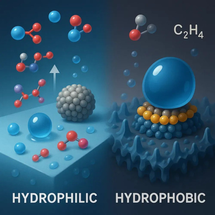 亲水表面能够显著吸附和富集极性分子,如水或醇类底物,有效提升这些反应物在界面的可及性,降低传质阻力。这对于水相催化、光催化分解水等反应极为关键,有助于提升反应速率和效率。而疏水表面则更有利于富集非极性底物,如烷烃、某些气体或有机小分子,减少水等极性分子的干扰和副反应。部分催化体系还通过构建双亲性或梯度型亲疏水界面,实现多组分反应物的定向自组装和协同转运,从而显著提升催化效率和底物选择性。