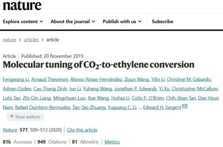 该研究提出通过分子修饰调控催化剂局部微环境,优化Cu表面的亲疏水性和极性,实现对CO₂还原为乙烯的高选择性。研究团队在Cu表面沉积有机二氢吡啶类分子膜,系统考察了分子电子给体能力对中间体(*CO)吸附构型与反应路径的影响。结果发现,适度电子给体的分子能稳定Cu表面的atop位CO中间体,促进其进一步偶联生成乙烯,使法拉第效率提升至72%,且在中性水溶液体系中实现高电流密度和190小时的运行稳定性。原位拉曼和DFT分析揭示,分子层不仅调节了CO吸附能和界面极性,还通过水分子介导的电子转移,强化了对C₂产物生成路径的定向选择。这一策略为通过亲疏水和分子环境调控提升CO₂电催化选择性提供了新思路。